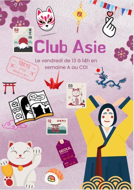 Les vendredis en semaine A, de 13h00 à 14h00, une quinzaine d'élèves, Collégiens et Lycéens, participent au Club Asie (centré principalement sur le Japon et la Corée du Sud.